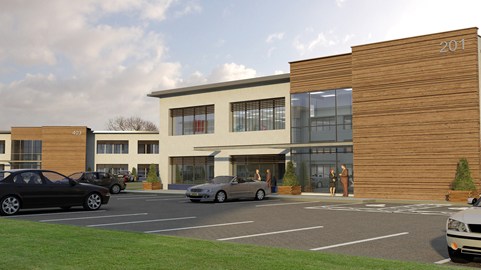 Cube Architecture and Design were commissioned by Property Alliance Group to design a speculative office development on an environmentally sensitive site in Leigh, Wigan. The site sits behind the East Lancs link road from Liverpool to Manchester and is adjacent to a nature reserve. Due to the nature of this development, 30% of the gross site area has been designed as a semi wetland area with raised walkways and a Sustainable Urban Drainage System (SUDS), all accessible for the users of the development.
